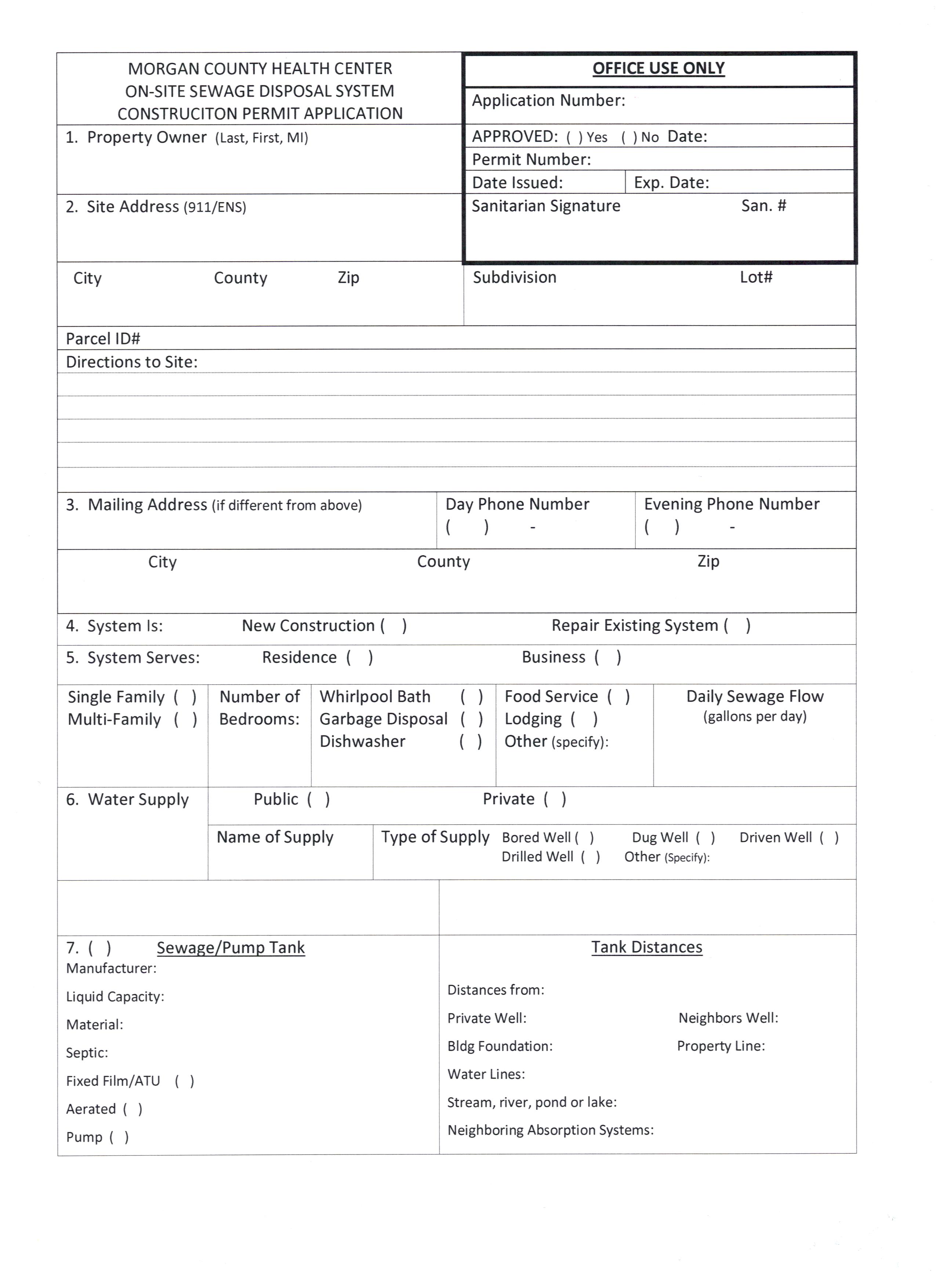 Chapter 701.025-701.059 RSMo, which regulates the disposal of sewage, was passed into law in 1995. Under chapter 701 owners of all buildings where people live, work or otherwise congregate are required to provide a means of sanitary disposal of all sewage generated in such building. On residential lots smaller than five acres and on all commercial lots the owners are required to obtain a construction permit and follow all rules and regulations regarding the minimum construction standards for the sewer system. Residential lots larger than five acres that are adjacent to the Lake of the Ozarks are also required to obtain a construction permit. In July of 1997 the Missouri Department of Health and Senior Services delegated this governing authority to the Morgan County Health Center and other local public health associations. The Environmental Health Specialists at MCHC are responsible for implementing the rules and regulations set forth by MO DOH as well as investigating sewage complaints in Morgan County. Application packets for construction permits are kept in the office and include a partial list of Missouri registered installers in the tri-county area as well as a statewide list of Missouri Soil Scientists and Professioanl Engineers. Copies of the On-Site sewage Rules and Regulaitons booklets may also be obtained at the office. Forms are also available for downlaod.